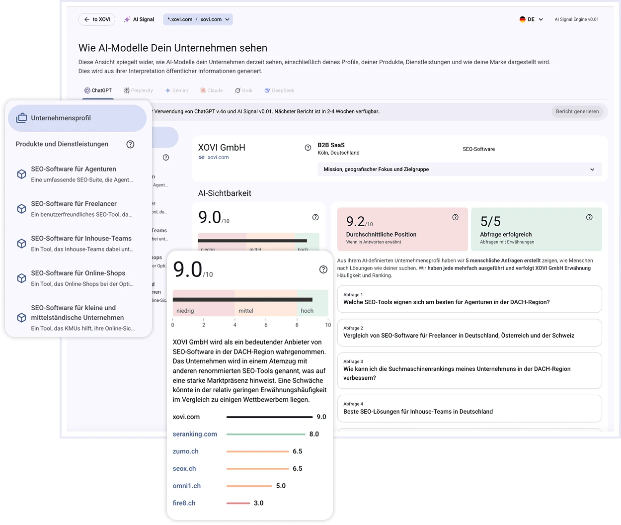 Der XOVI AI Signal ist ein Sichtbarkeits-Tracker, der zeigt, wie dein Unternehmen in den Antworten von KI-Assistenten wie ChatGPT, Claude und Gemini erscheint.