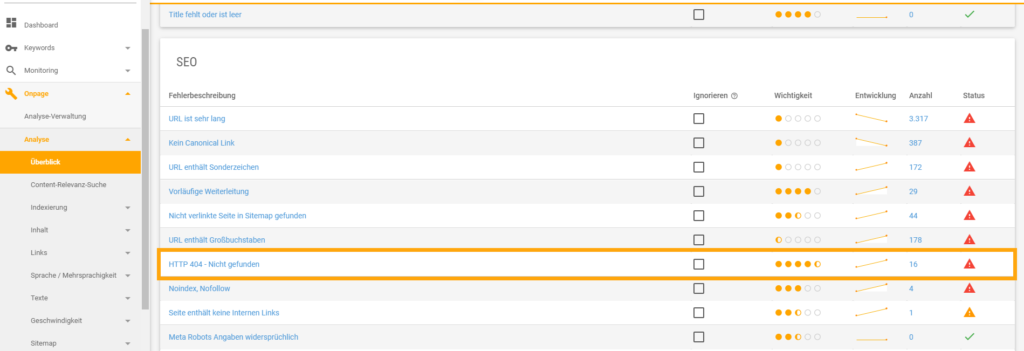 XOVI zeigt dir alle 404-Fehler deiner Seite an. Voraussetzung dafür sind