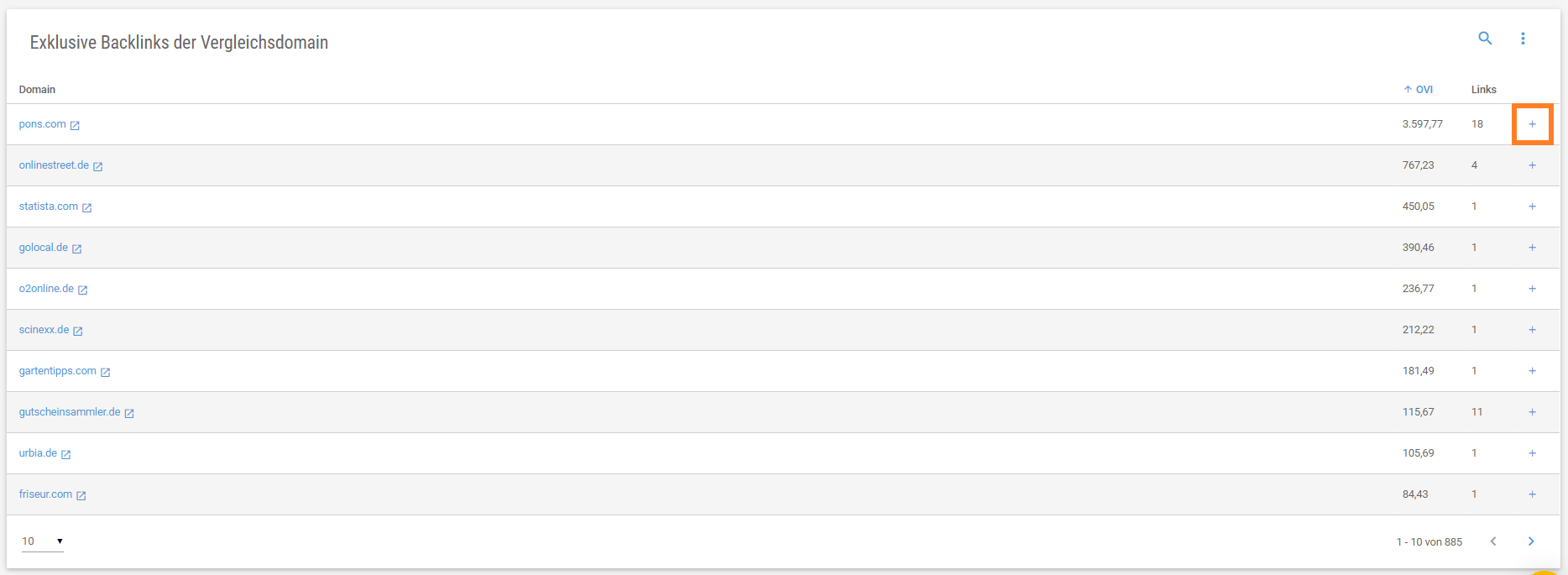 Alle Tabellen liefern dir den OVI der Website, die den Backlink gesetzt hat. Außerdem siehst du in jeder Spalte die Anzahl der Backlinks, die du und/oder die Vergleichsdomain von der Website erhalten ha(s)t.