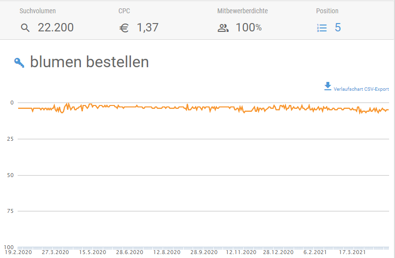 An dieser Stelle erhältst du den entscheidenden Hinweis, dass mit dem Dokument https://www.blume2000.de/blumen-verschicken/ und dem Keyword „Blumen-bestellen“ etwas nicht stimmt. Daher prüfst du erst einmal wie das konkrete Suchvolumen von „Blumen bestellen“ (ohne Bindestrich) lautet: