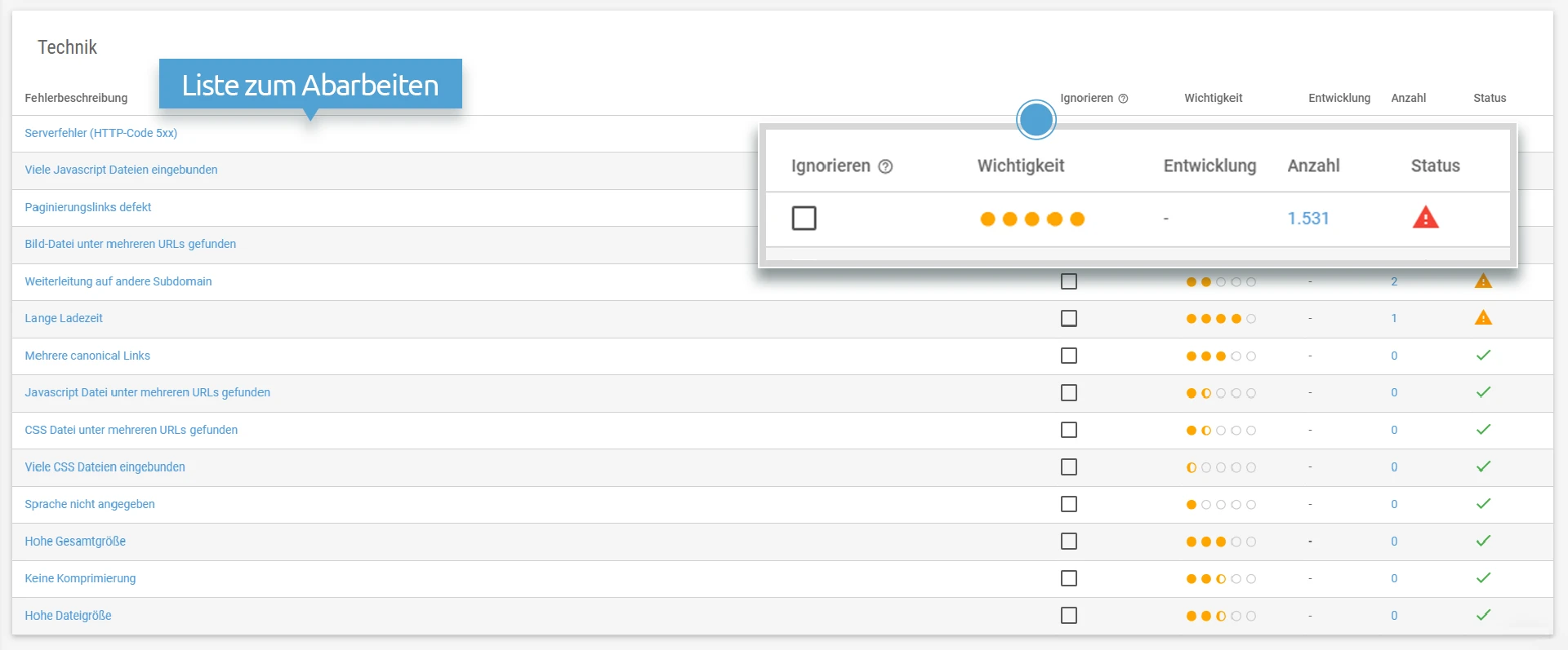 Die Ergebnisse der Onpage-Analyse zeigen dir, um welchen Befund du dich zuerst kümmern solltest. Für jede Meldung kannst du die Liste der betroffenen URLs ganz leicht exportieren. Behebe sie selbst oder gib die Liste an einen Zuständigen weiter.