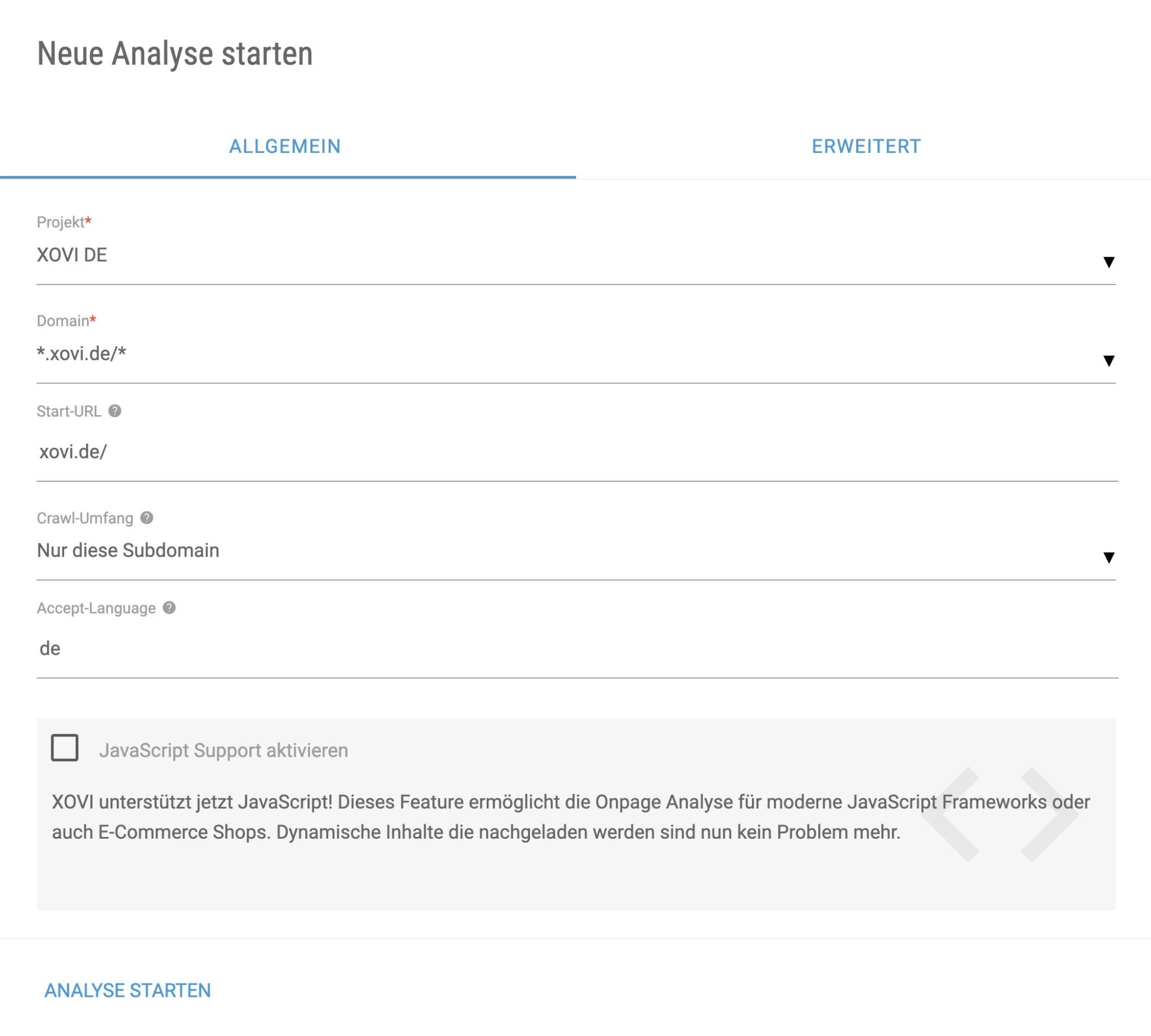Moderne Webseiten stellen besondere Anforderungen an die Onpage-Analyse. Da dynamische Inhalte, wie sie häufig durch JavaScript nachgeladen werden, nicht ohne Weiteres erfasst werden können, haben wir unsere Onpage-Analyse um eine praktische Funktion erweitert. Mit XOVI lassen sich nun auch Websites analysieren, die dynamische Inhalte nachladen – ideal für Shopsysteme und moderne JavaScript-Architekturen. Du kannst diese Funktion ganz einfach beim Erstellen einer Analyse aktivieren.