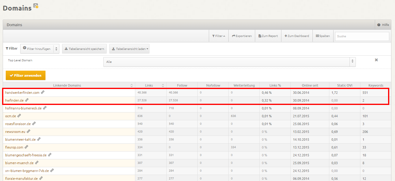 Zur Ergründung dieser Diskrepanz schauen wir uns unter Links > Domains > Überblick einmal die Domains an, die die Seite von Fleurop verlinken. Wir sehen dort, dass allein schon die Domains handwerkerfinden.com und hwfinden.com 67.892 Backlinks liefern. Beide Domains weisen übrigens zur selben Website: Ein Webverzeichnis für Handwerker.