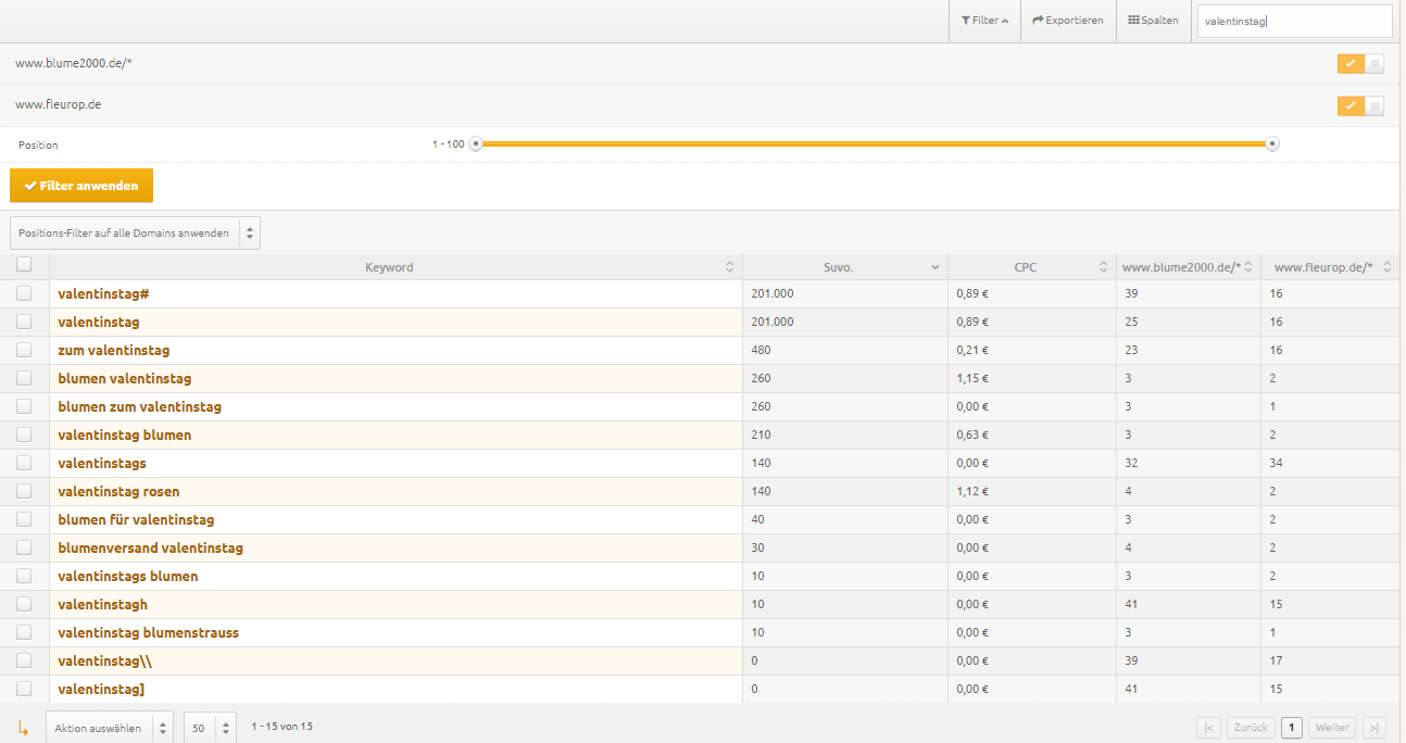 Wir wechseln also in den Toolbereich Keywords > Rankingvergleich. Oben im Eingabefeld ergänzen wir nun die zweite Domain, so dass die Domains blume2000.de und fleurop.de verglichen werden. Sobald wir auf „Analyse starten“ geklickt haben, werden die Keywords abgeglichen und die Rankings gegenübergestellt. Nun nutzen wir die Suche in der Tabelle um alle Keywords zu filtern, die das Wort „Valentinstag“ enthalten.