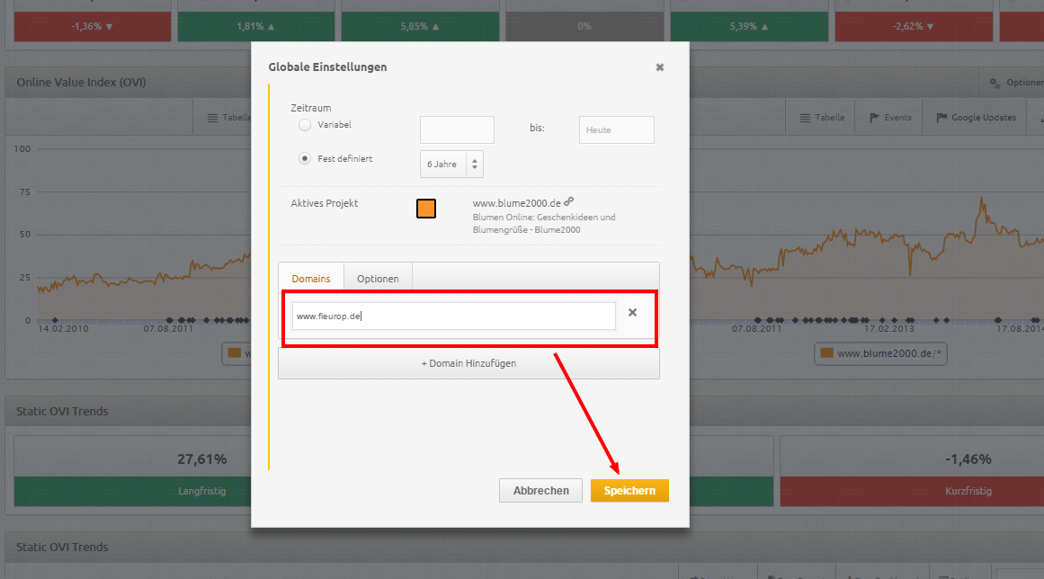 Wenn wir die Entwicklung der Sichtbarkeit der beiden Domains anschauen wollen, dann können wir das ganz einfach tun, in dem wir die zweite Domain in den Charts einfach als weitere Domain hinzufügen. Klicken Sie bei einem Chart einfach auf „Optionen“. Es erscheint dann ein Dialogfeld „Globale Einstellungen“
