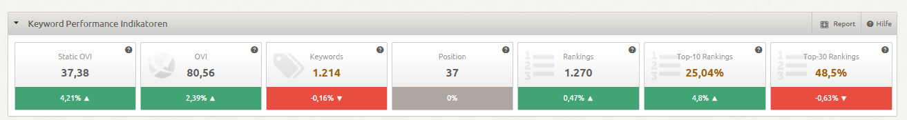 Fangen wir mit der Sichtbarkeit an. Wir vergleichen nun also die Keyword Performance Indikatoren, um einen schnellen Überblick zu erhalten. Diese finden sich jeweils im Keyword-Tool in der Überblick-Seite ganz oben.