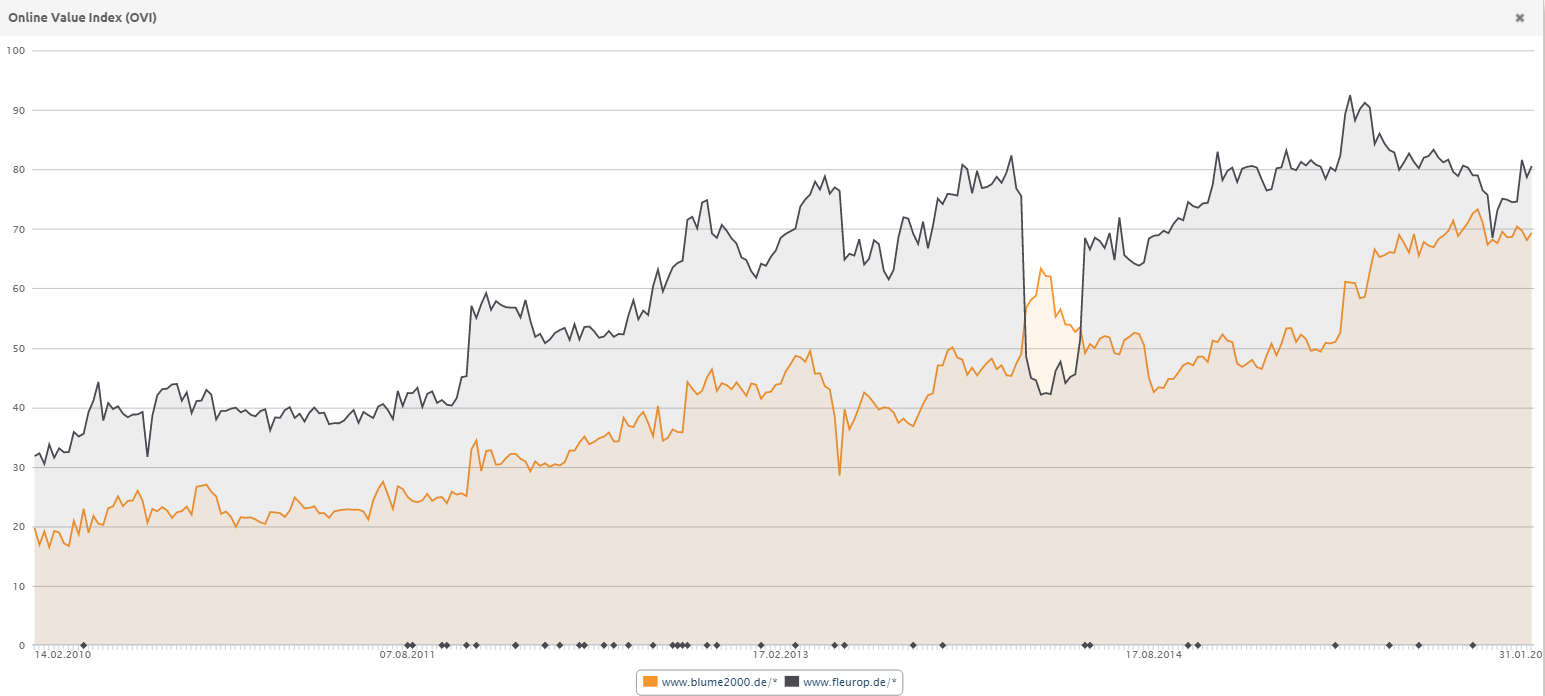 Wir können erkennen, dass in den vergangen sechs Jahren fast immer Fleurop in der Sichtbarkeit deutlich vorne gelegen hat. Lediglich Anfang 2014 haben die Domains über ein paar Wochen einmal die Plätze getauscht – Fleurop hat dann aber wieder zu alter Stärke zurück gefunden und führt den Sichtbarkeitswettbewerb jetzt wieder deutlich an.