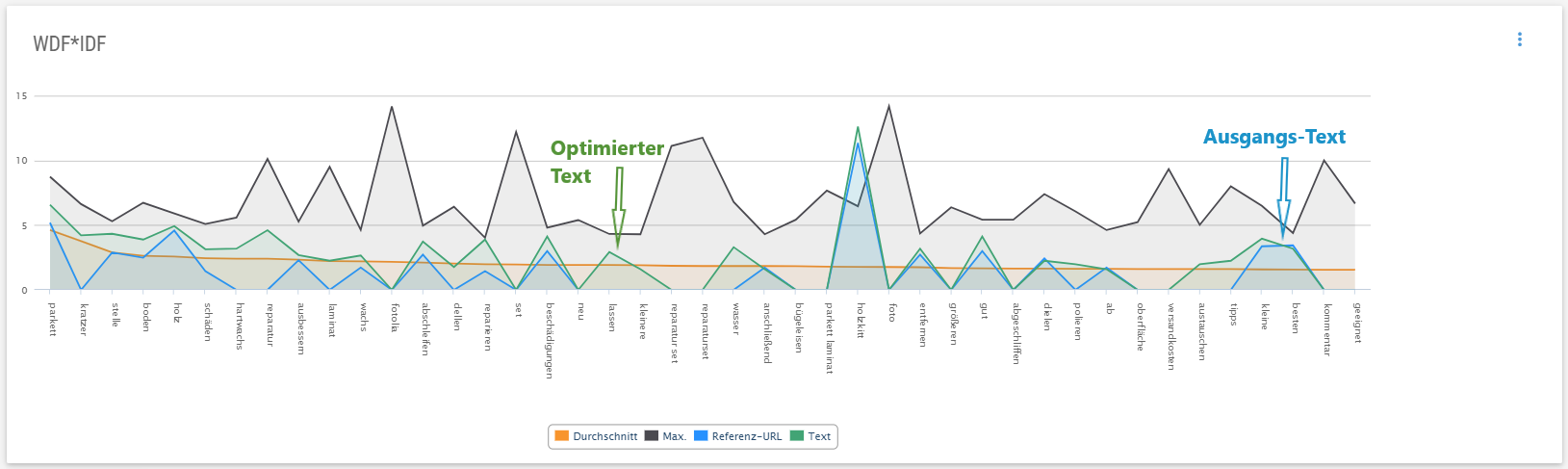 | Text | WDF*IDF Wert deines bearbeiteten Textes. Sobald du den geladenen URL-Inhalt deiner im Textfenster optimierst, zeigt dir diese Linie die Veränderung an. |