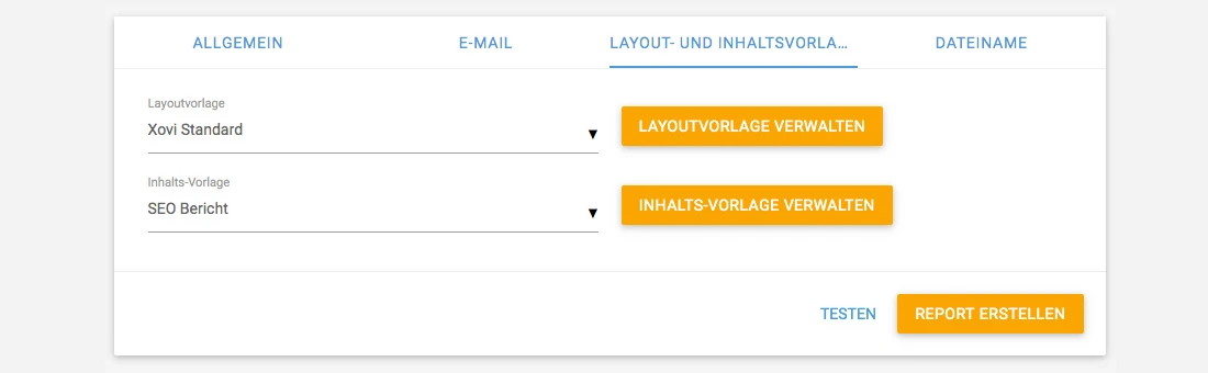 Deine unkomplizierte Lösung für individuelle SEO-Reportings: Nutze bestehende Vorlagen oder erstelle individuelle Templates für Inhalte und Layouts. Füge mit wenigen Klicks jeden beliebigen Datensatz aus der XOVI Suite zu einem Report hinzu – auch die von Mitbewerbern oder aus verknüpften Tools wie Google Analytics. So präsentierst du mit wenig Aufwand alle wichtigen SEO-Daten in einem einzigen Report.